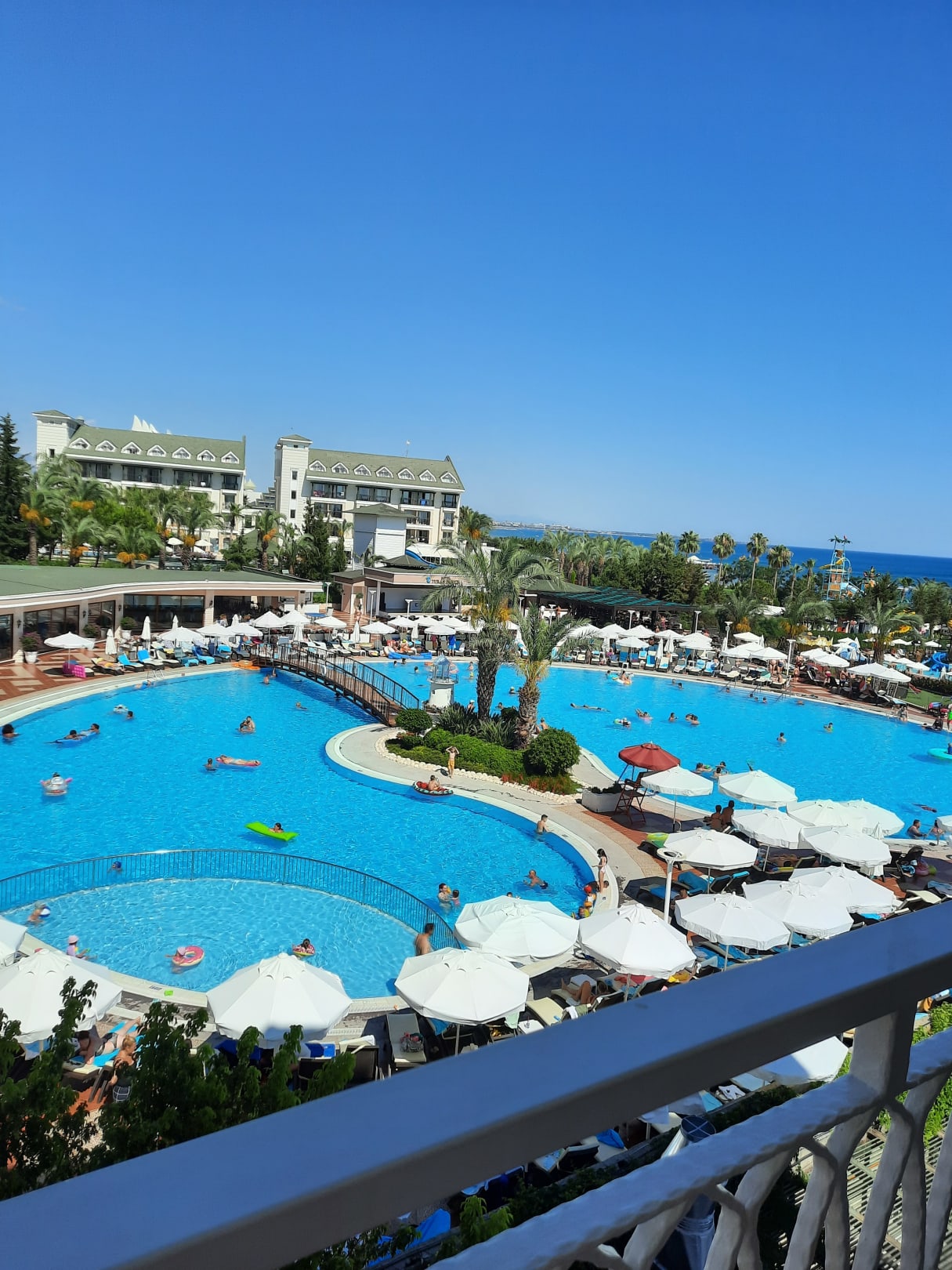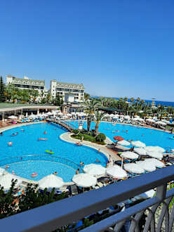 ZimmerBlick aus Familienzimmer mit seitlichem Meerblick und Etagenbett. Vormittags noch Sonne auf dem Balkon. Blick auf Meer und Pool vom Nachbarhotel Turan Prince. Wenn man erst spät ins Bett geht super Zimmer im Block 6. Nachts leider sehr laut bis 24Uhr