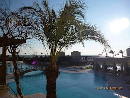 Blick vom Hotel - 1. Stock - in Richtung Hafenblick von der terrasse in der 1. etage über die poolanlage in richtung meer/hafen.