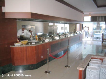 Speisesaal Abendbuffet Hotel Aspendos Beach. Hier gibt es frisch zubereitete warme Speisen und lange zweireihige Gästeschlangen davor.