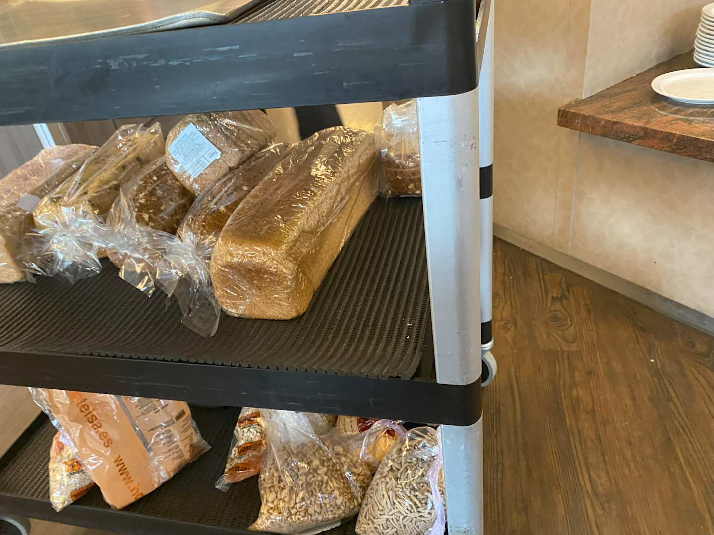 Nachschub Brot und Körner direkt aus Tüten in die Behälter im Restaurant