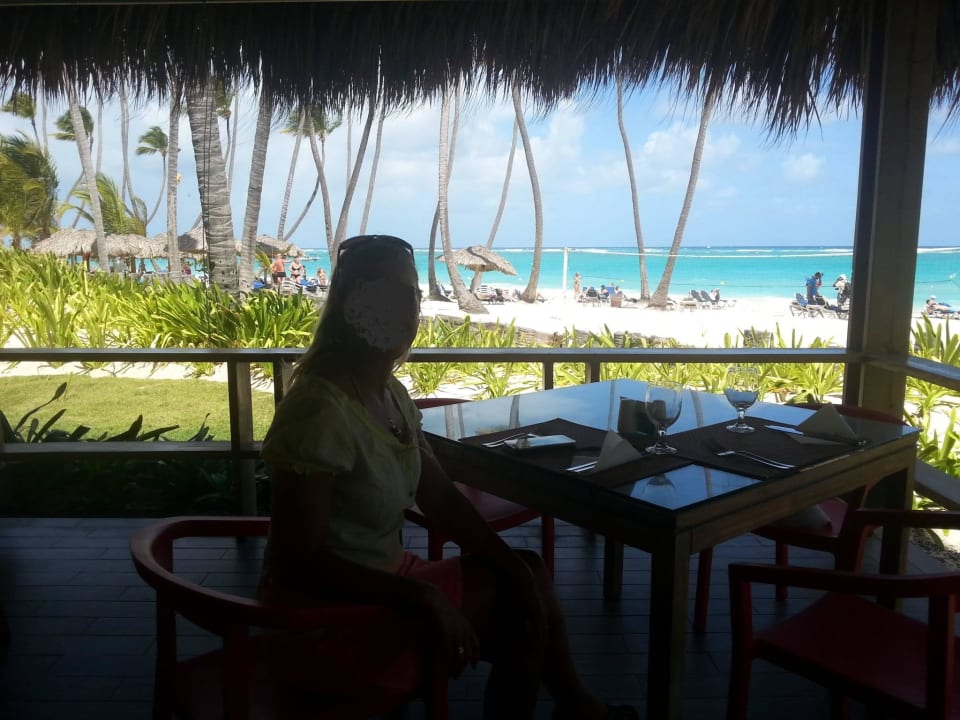 Toller Blick beim Mittagessen auf Strand und Meer