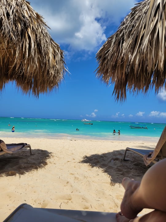 StrandAussicht von den Strandliegen. Handtücher kann man sich täglich, kostenfrei direkt am Strandzugang abholen und abends wieder abgeben. Toll!