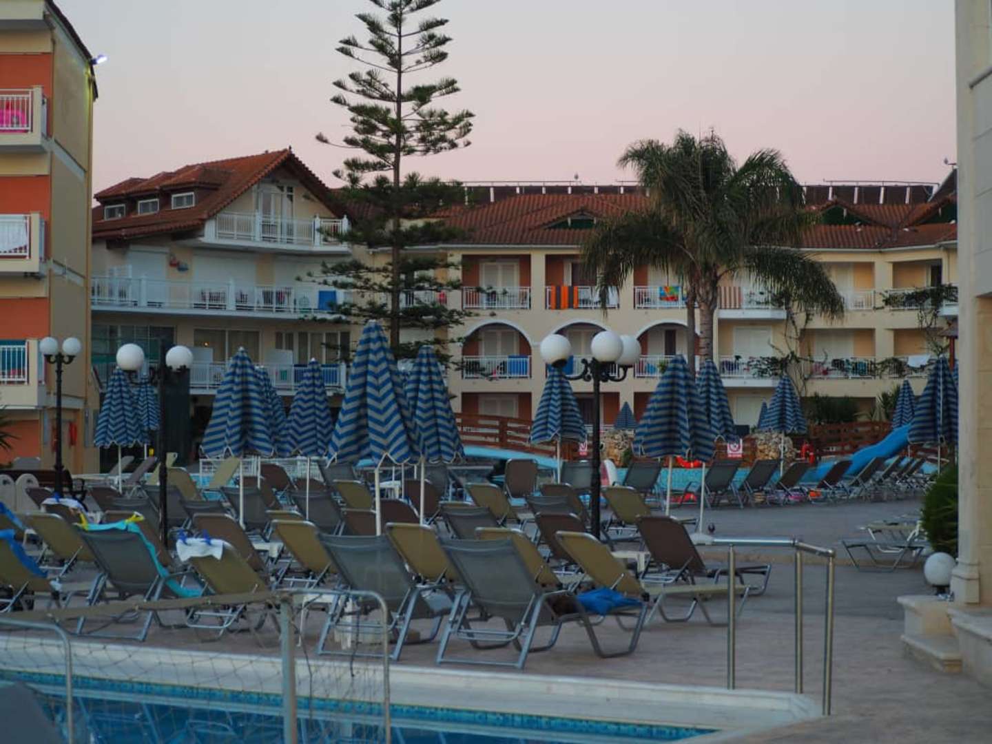 Kawałek basenu z bramkami i widok na hotel