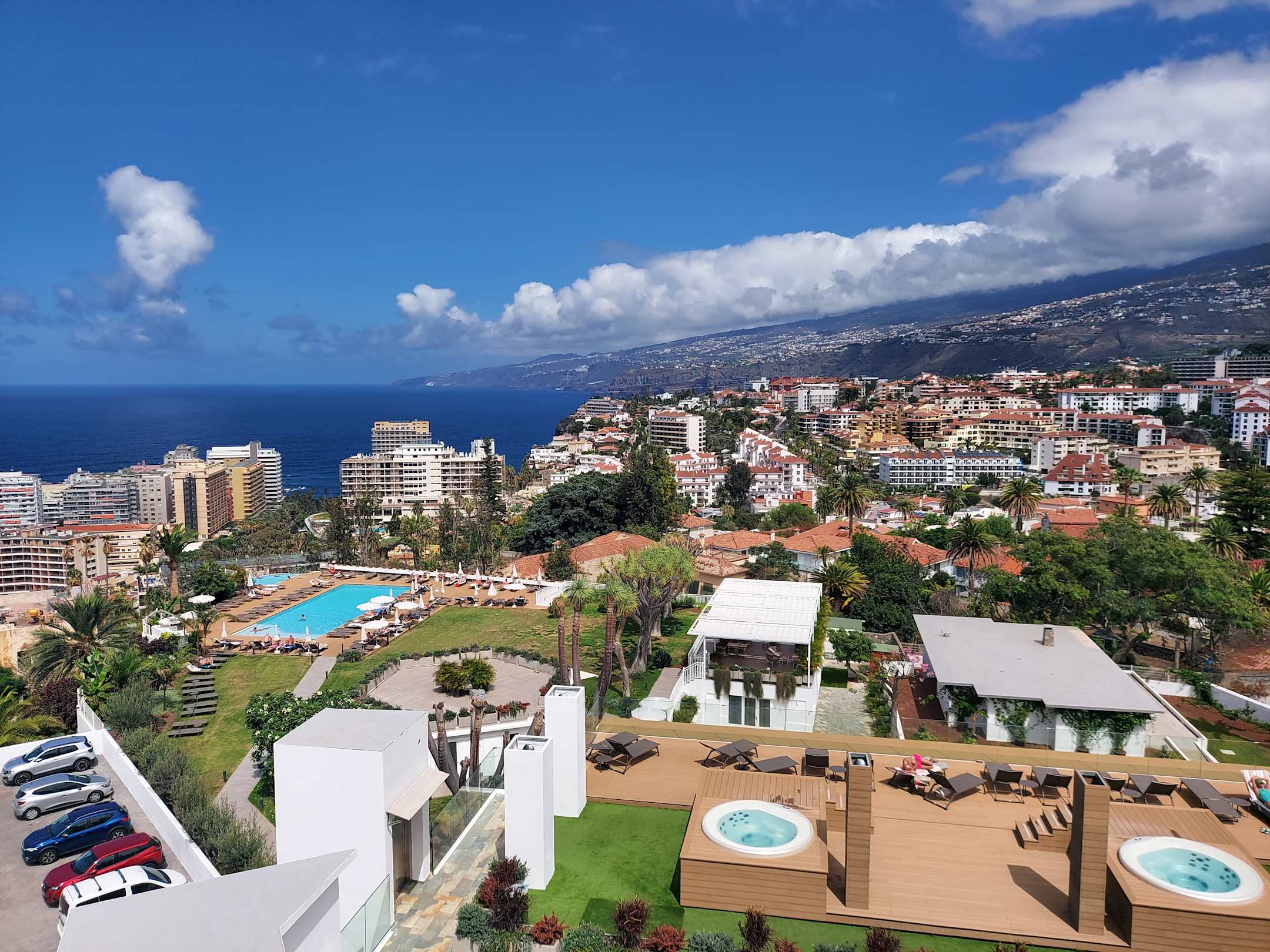 Ausblick von oben auf die Whirlpools und den Garten