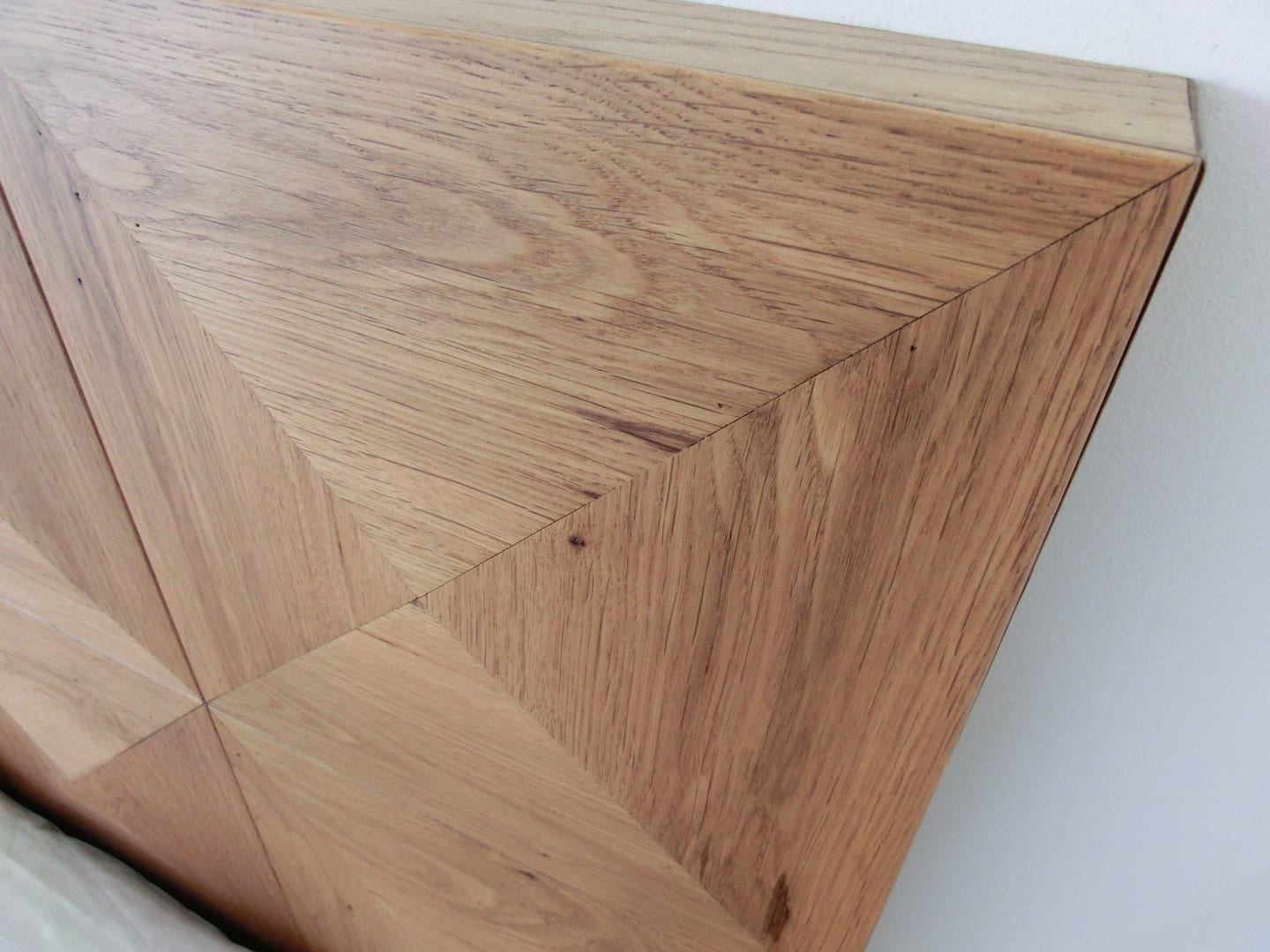 ZimmerNahaufnahme vom Holz des Bettes (Kopfteil) Hat mir sehr gut gefallen, sieht auch hochwertig aus. Passt gut zum sonst weißen Ambiente.
