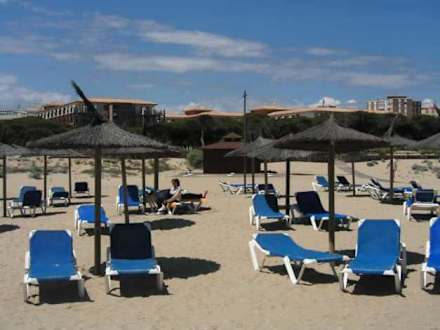 HotelstrandVom Meer aus gesehen - im Hintergrund Strandbar/-kiosk, rechts daneben Holzbohlenweg, im Hintergrund das Hotel
