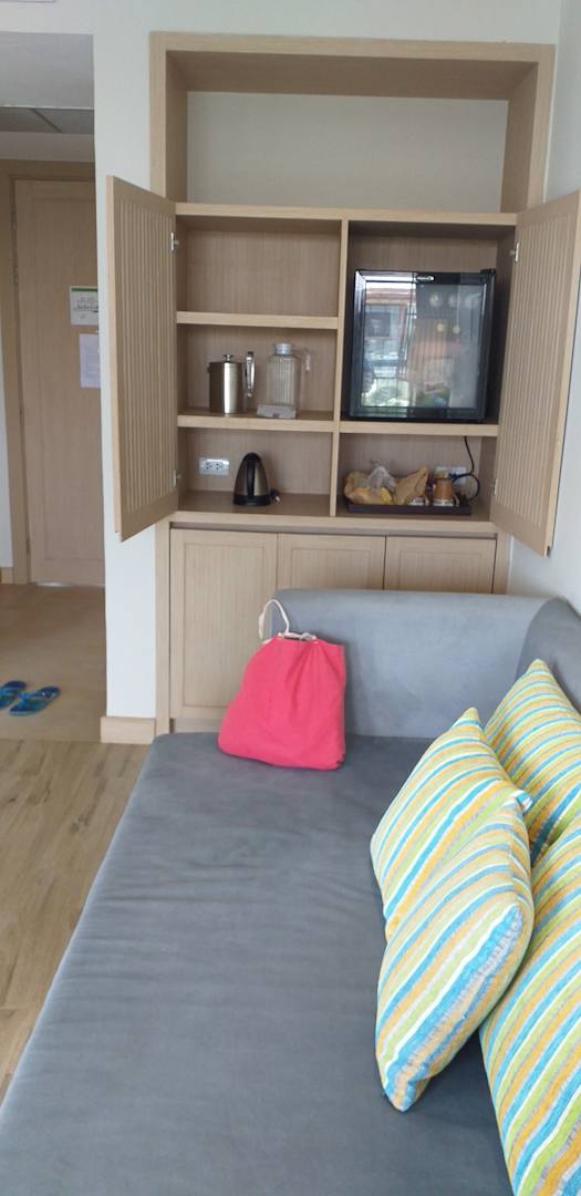 Extra abgetrennter Wohnbereich mit Sofa und TV und Kaffeebar mit kostenlosen Snacks und kleinem Kühlschrank. Ein zweites Fernsehgerät im Schlafbereich.