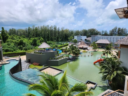 AusblickAusblick aus dem Zimmer nach rechts auf den Kinderbereich der riesigen Poollandschaft auf mehreren Ebenen (nach links)