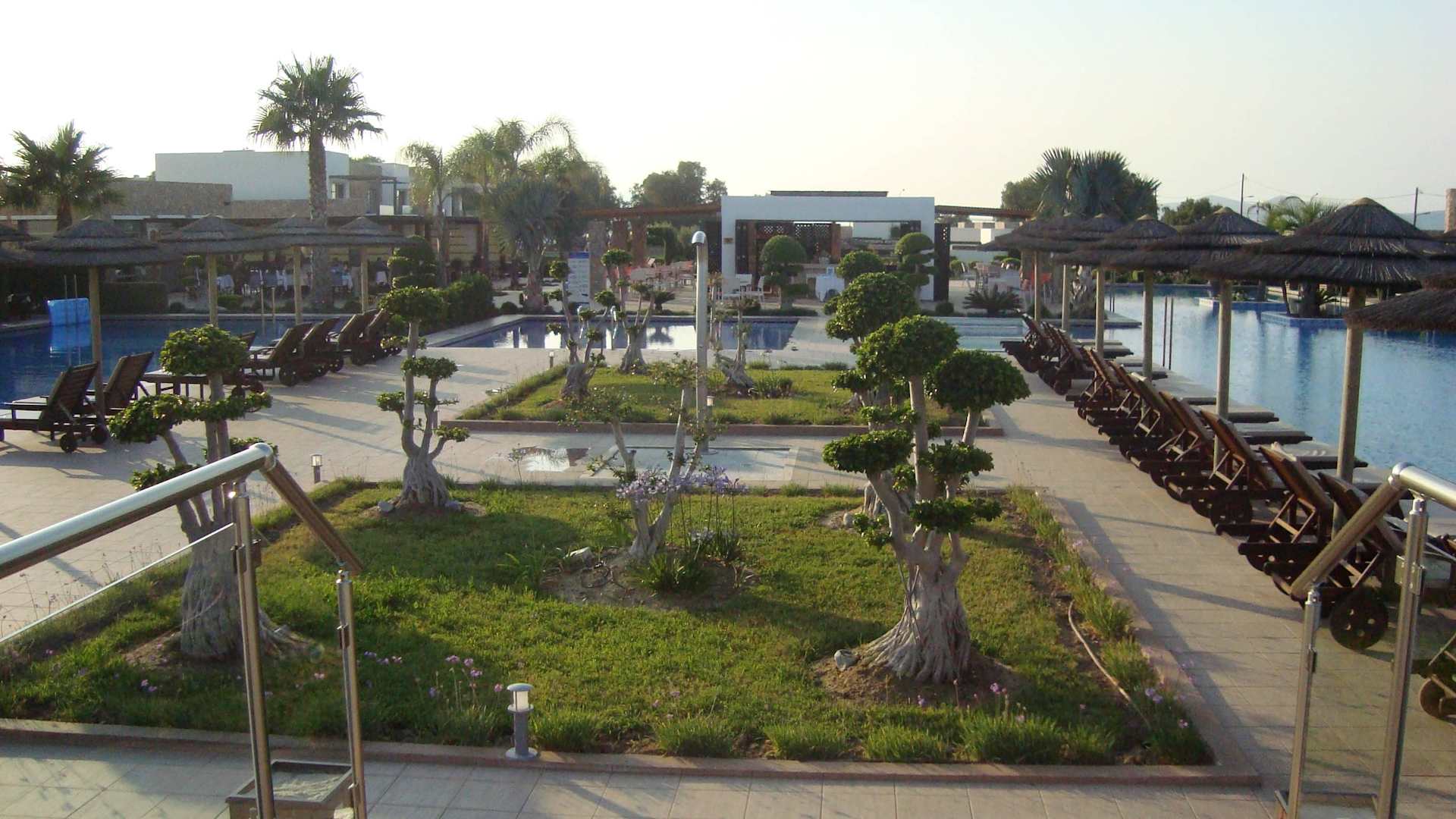 Blick auf das Mittelteil der Poolanlage Das Mittelstück von der Poolanlage. Links und rechts die Häuser, dazwischen der Pool