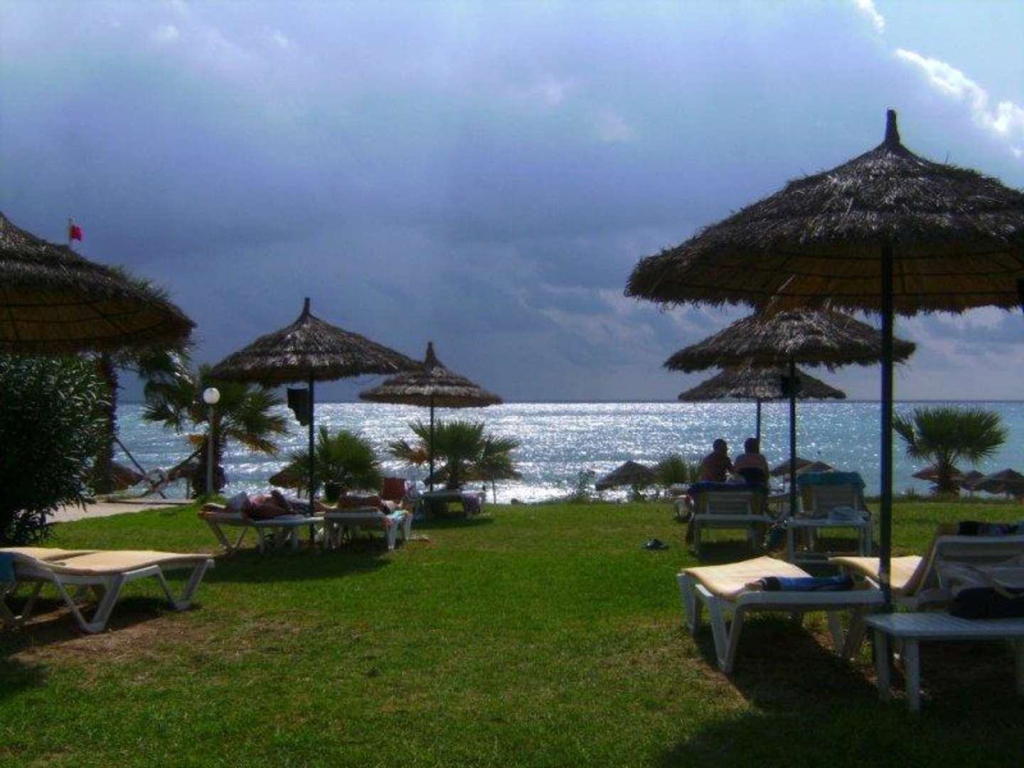 Blick von der Liegewiese Richtung StrandDie Wolken sehen bedrohlich aus, hatten allerdings 25°C und es regnete an diesem Tag nicht einen Tropfen!