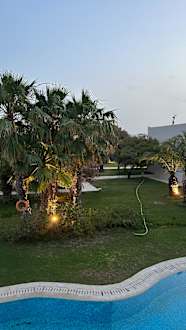 Blick auf den Garten und den Pool der Swimup-Zimmer.