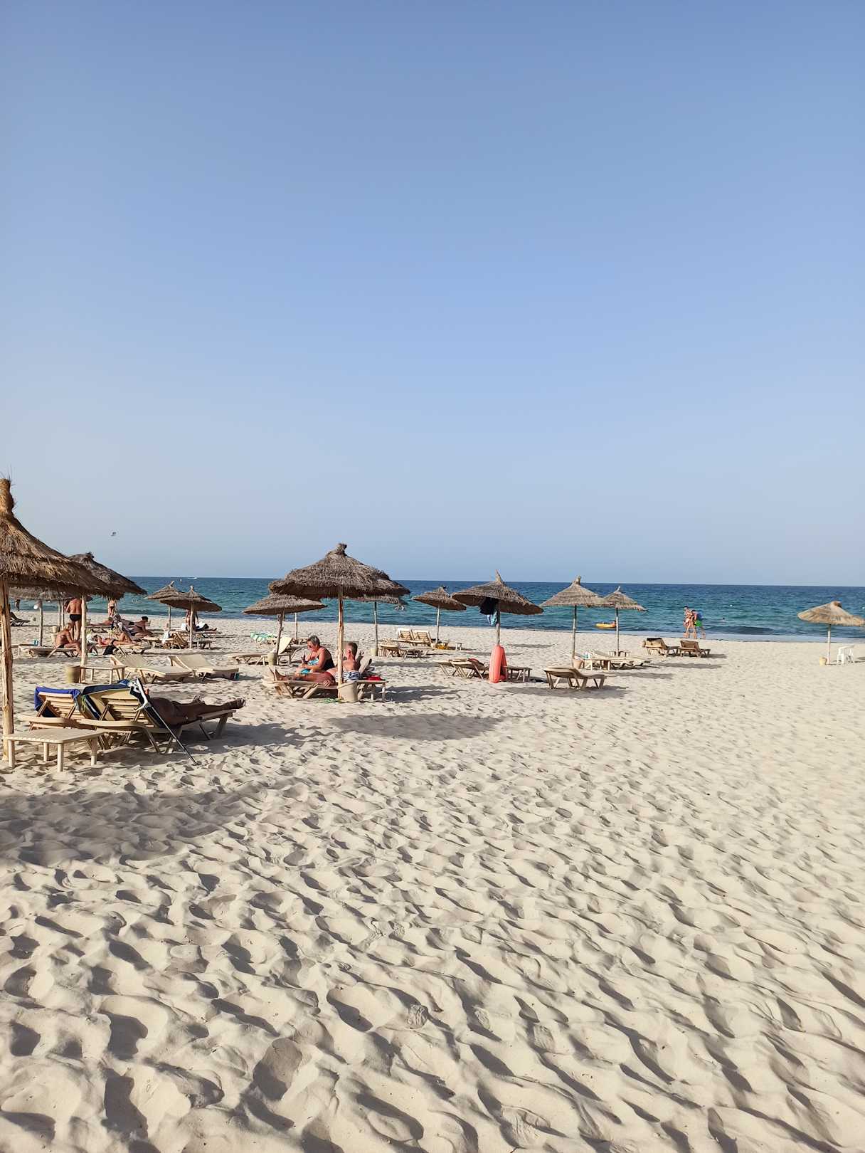 Wirklich schöner und feiner Sandstrand, gut gepflegt. Genügend Abstand zwischen den Liegen um schön mit dem Schatten der Schirme "wandern" zu können. Das Meer fällt schön flach ab