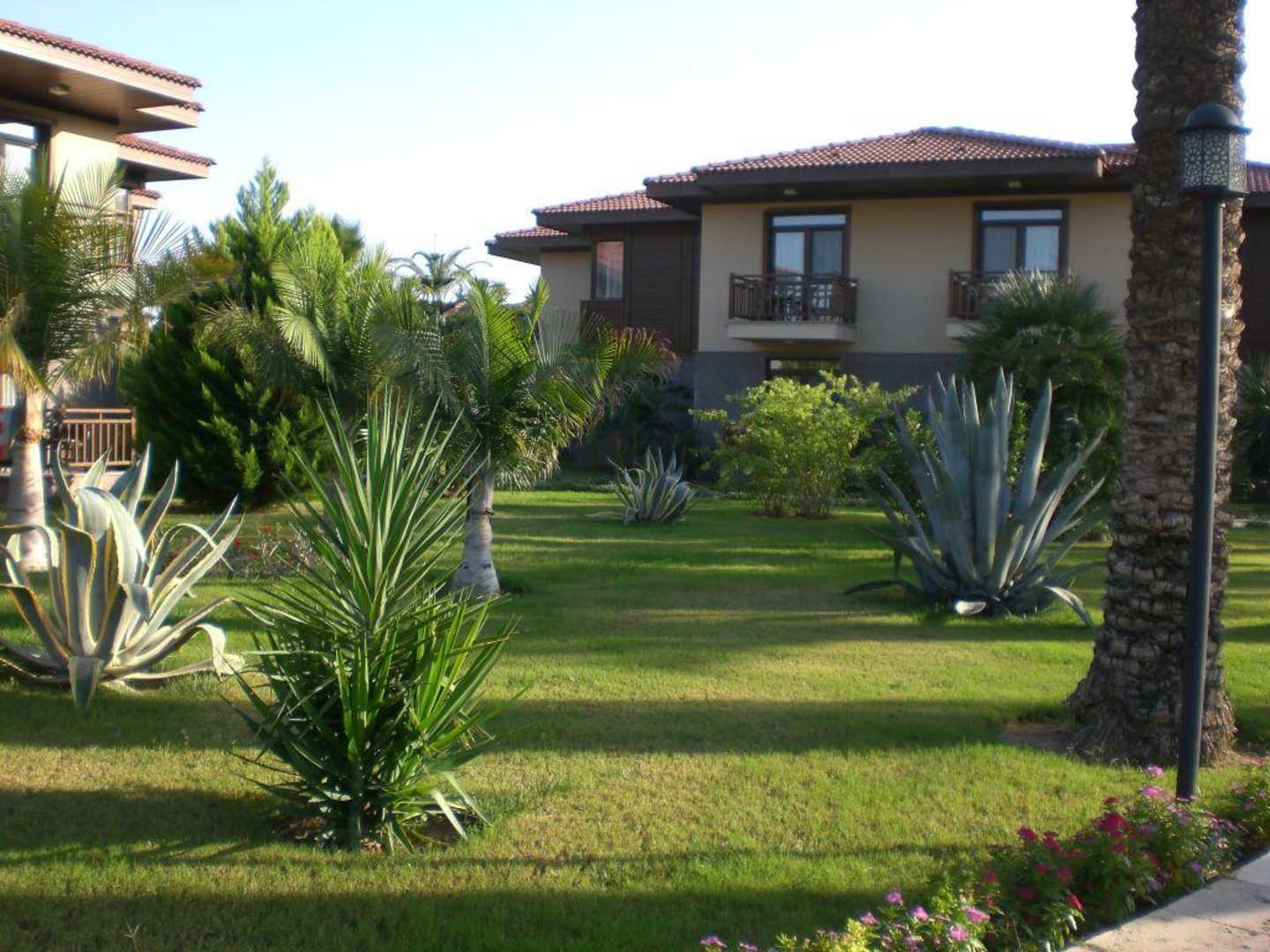 Bungalowsschön bepflanzt und im Hintergrund sind die Bungalows zu sehen
