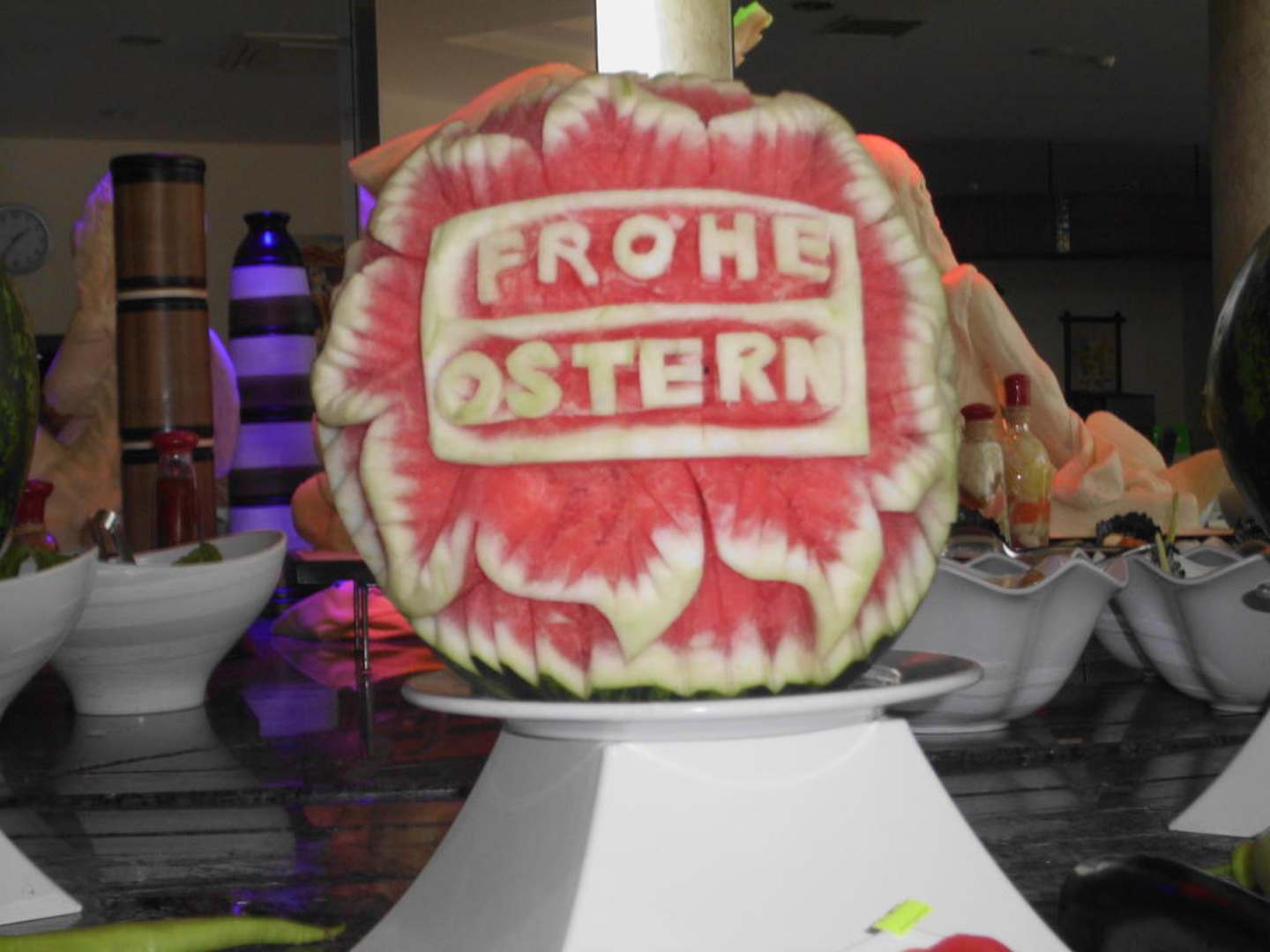 in eine Melone geschnitzt und coloriert