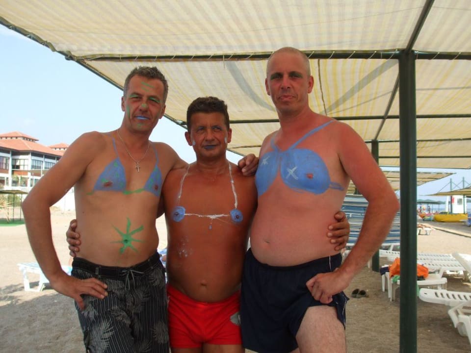 Wetten das ??? Die Buddis hatten mit den Kindern gewettet,daß sie keine zehn Männer finden ,die sich Bikinis aufmalen lassen. Die Kinder haben gewonnen :-)