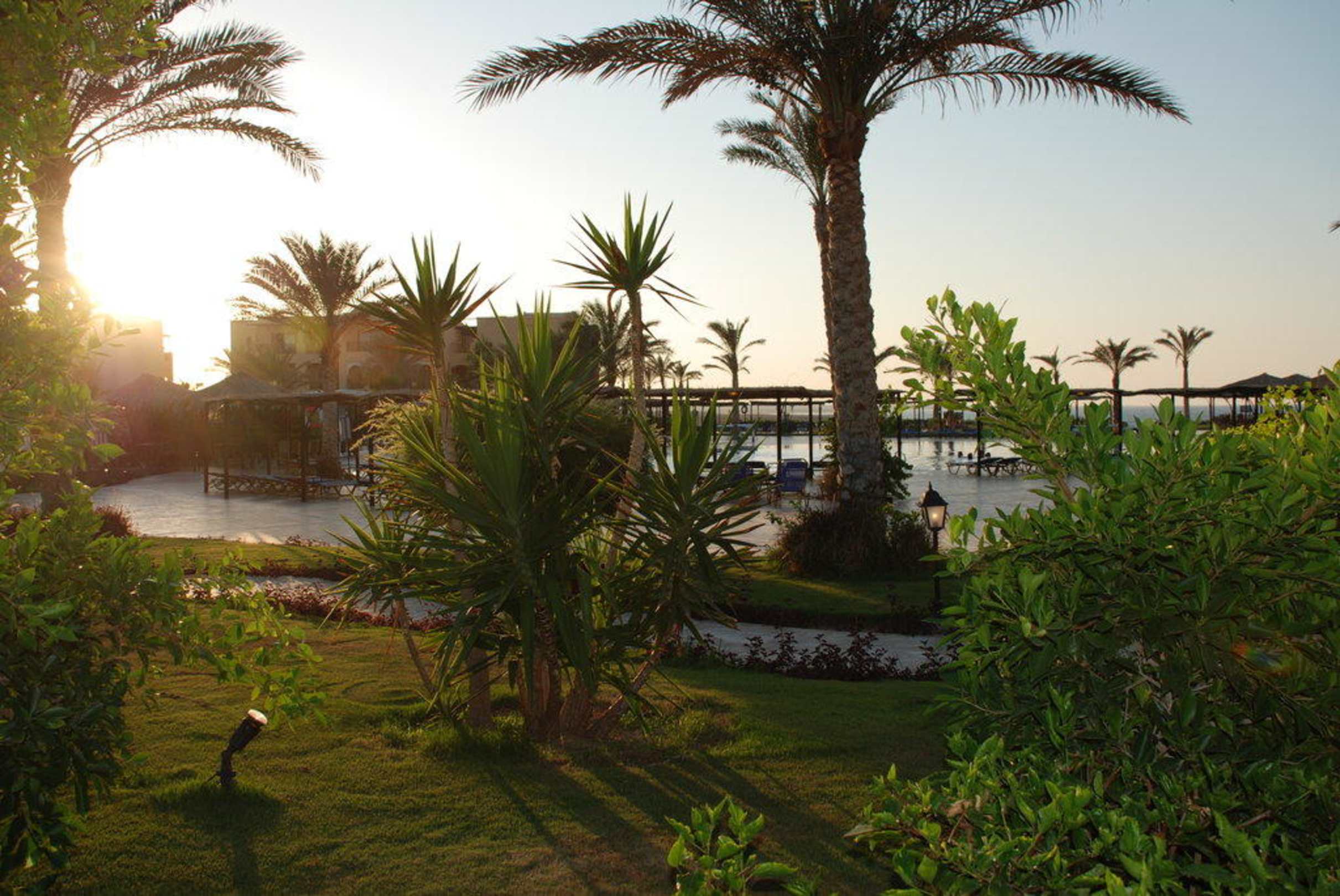 Sonnenuntergang beim AbendessenRestaurantterrasse Richtung Animationspool
