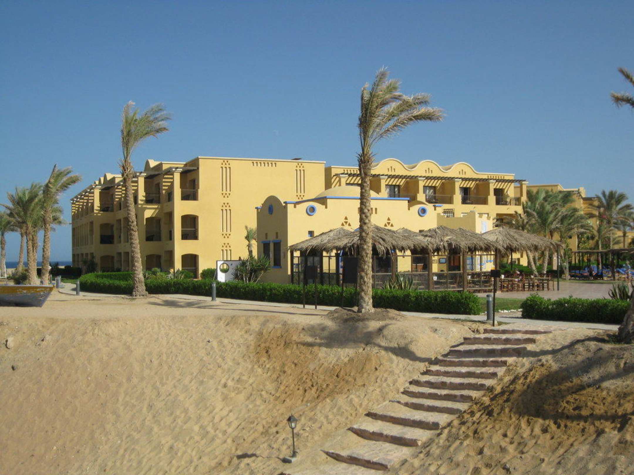 Die Treppen im Vordergrund führen zu den Strandliegen