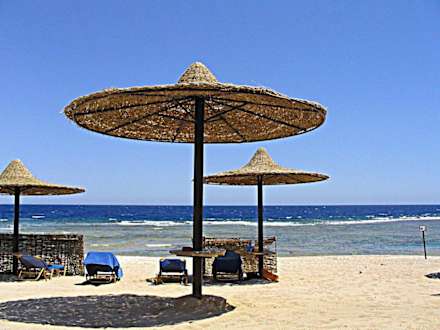 Kleine Bucht mit Sandstrand beim HotelSicht auf den Sandstrand, der in einer kleinen Bucht liegt mit angrenzendem Riff direkt beim Hotel.
