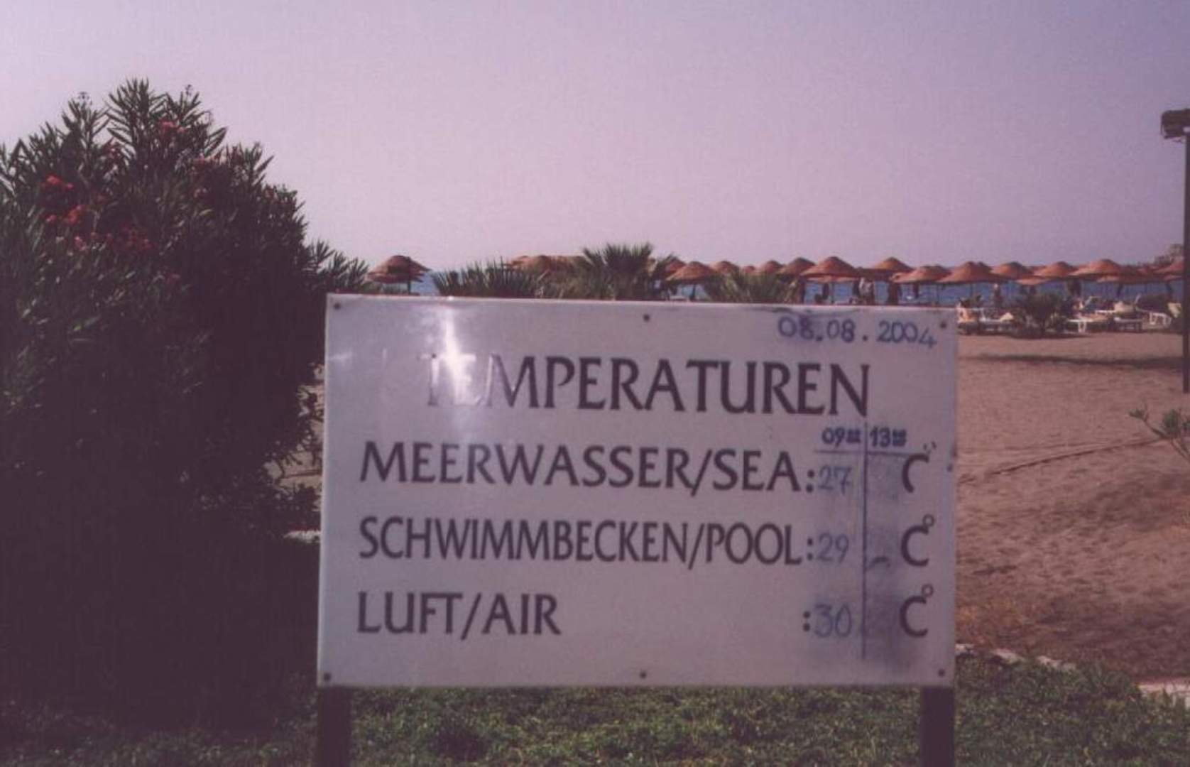 Temperaturschild am StrandTürkische Ägäis, Sarigerme, Hotel Iberotel Sarigerme Park, Temperaturschild am Strand