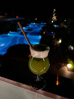 Poolsicht bei Nacht mit einer Eigenkreation der Barkeeper, hier war es Murat