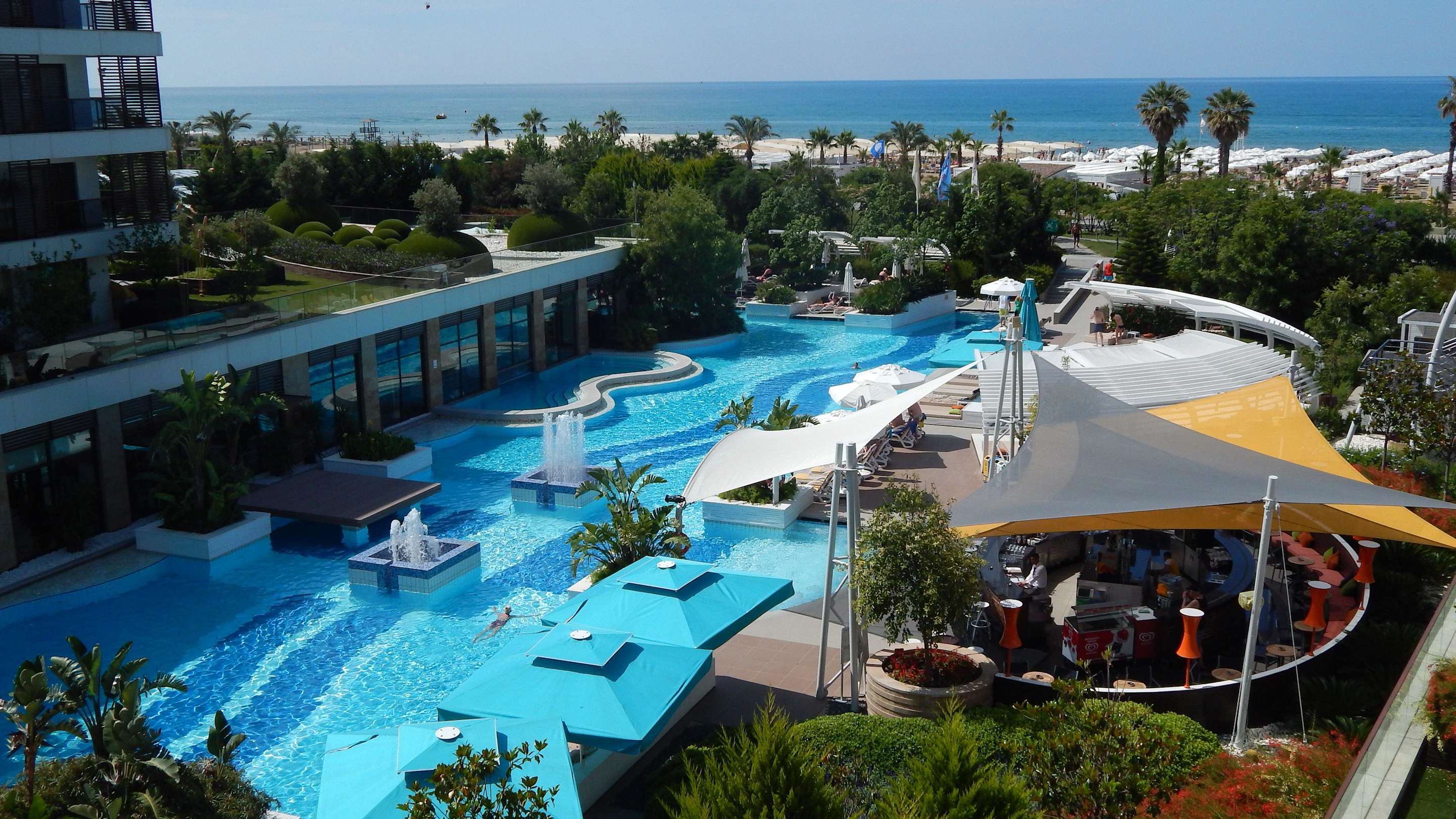Blick vom Zimmer über die Poolanlage Richtung Meer