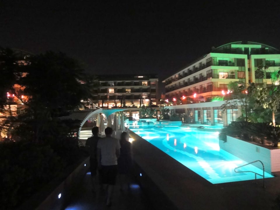 Das Hotel und Pool bei Nacht