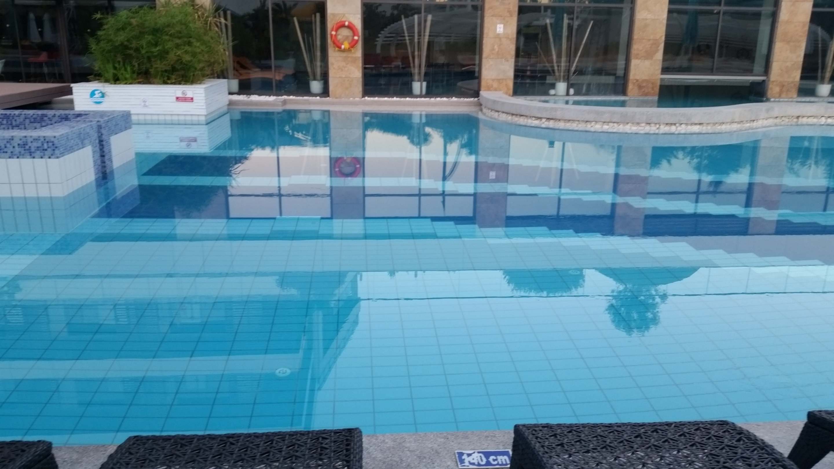 Der Pool im Hintergrund der Fitnessbereich