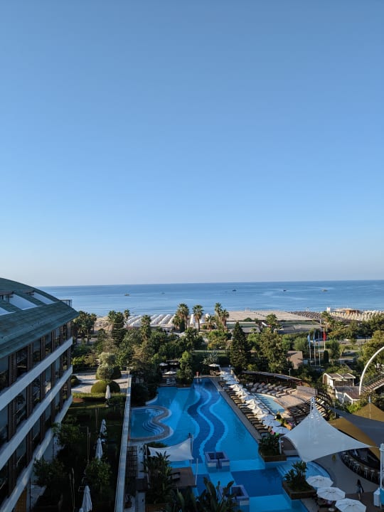 Blick von unserem Zimmer auf den Pool- und Strandbereich.