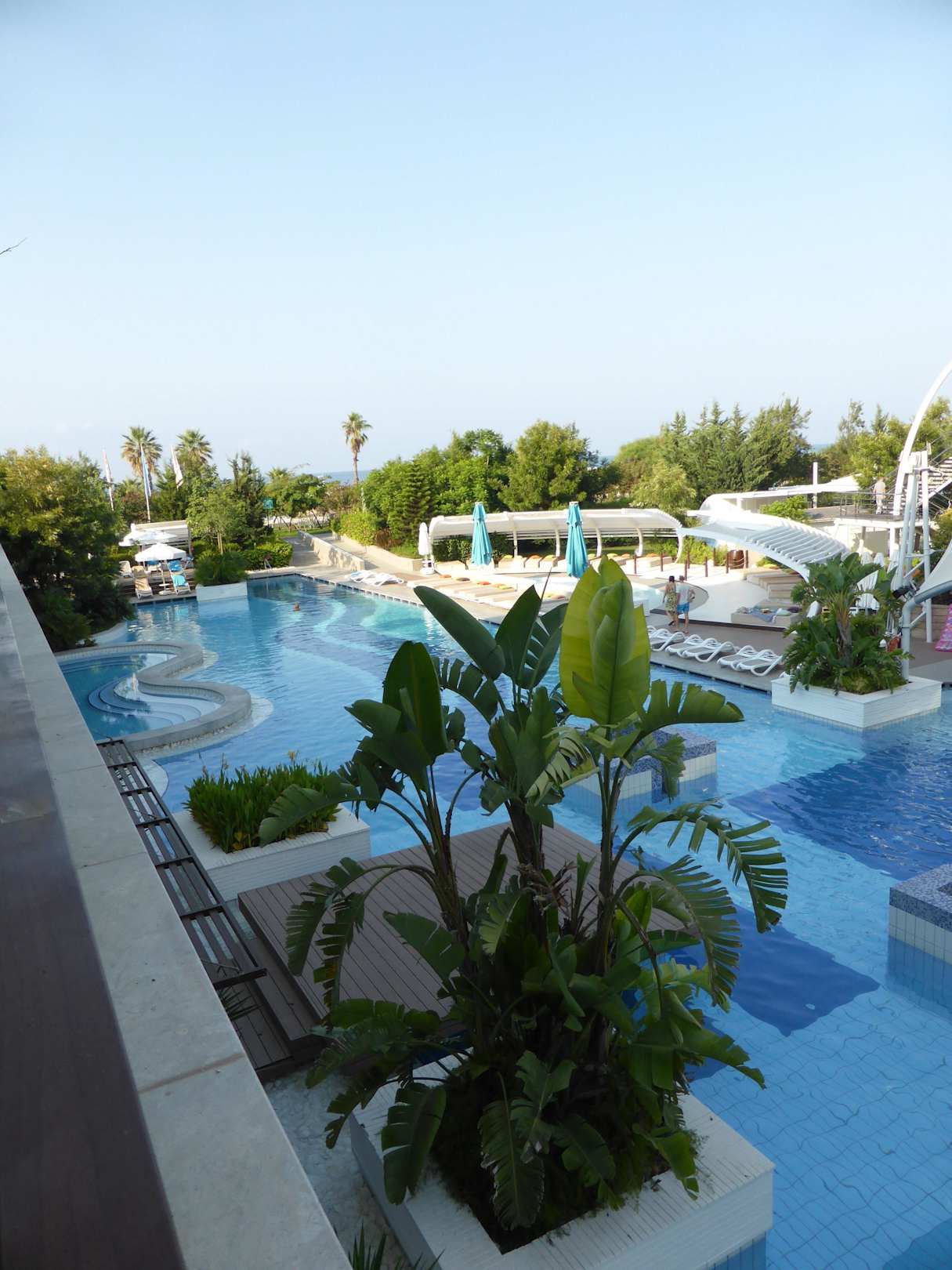 Blick zum PoolBild von der Terrasse unseres Zimmers mit seitlichen Meerblick auf die Poolanlage
