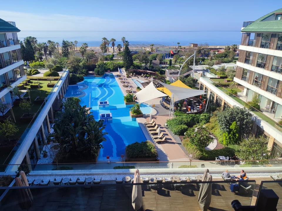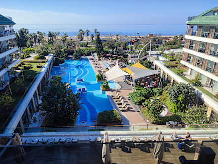 Blick vom Zimmer auf den Pool
