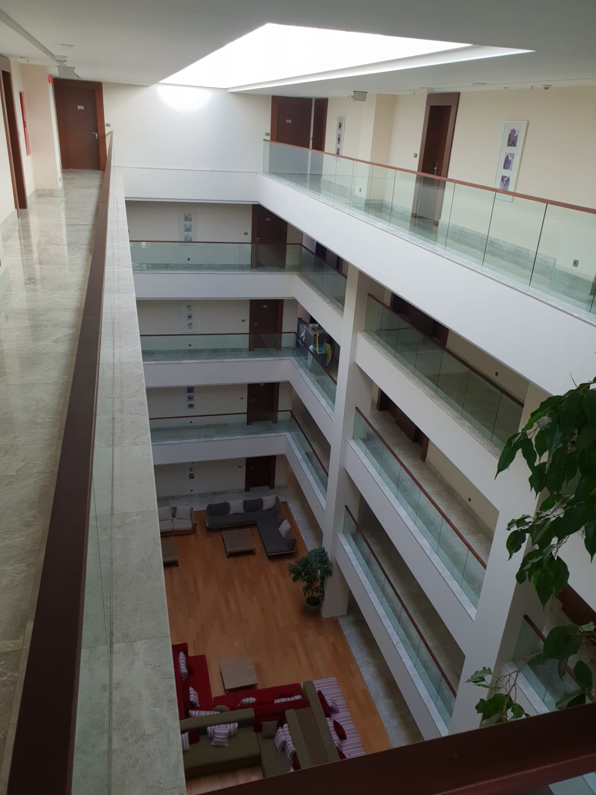 SonstigesDie Flure zu den Zimmern und Suiten in den links und rechts des Pools liegenden Gebäudetrakten.