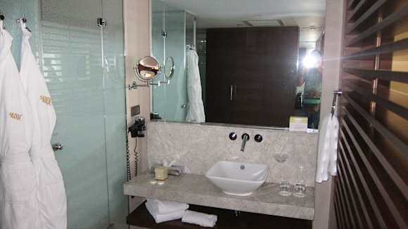 Waschtisch, links die Toilette