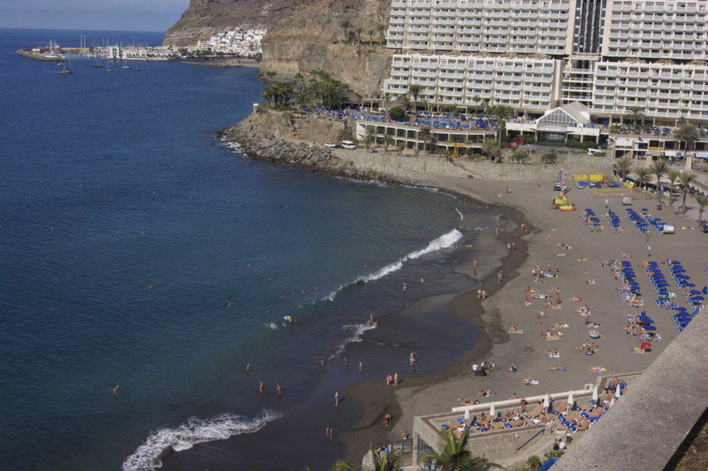 AusblickVopn der 9.Etage mit Ausblick auf den Strand,das Schwesterhotel und dem Jachthafen von Puerto Mogan