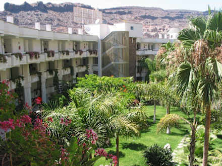 Die "Rückseite"Die grüne Rückseite des Hotels - also der Bereich zwischem dem Gebäude und der steilen Felswand, an die es gebaut wurde