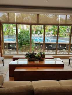 Ausblick aus dem Ausgangsbereich zu den Poolanlagen