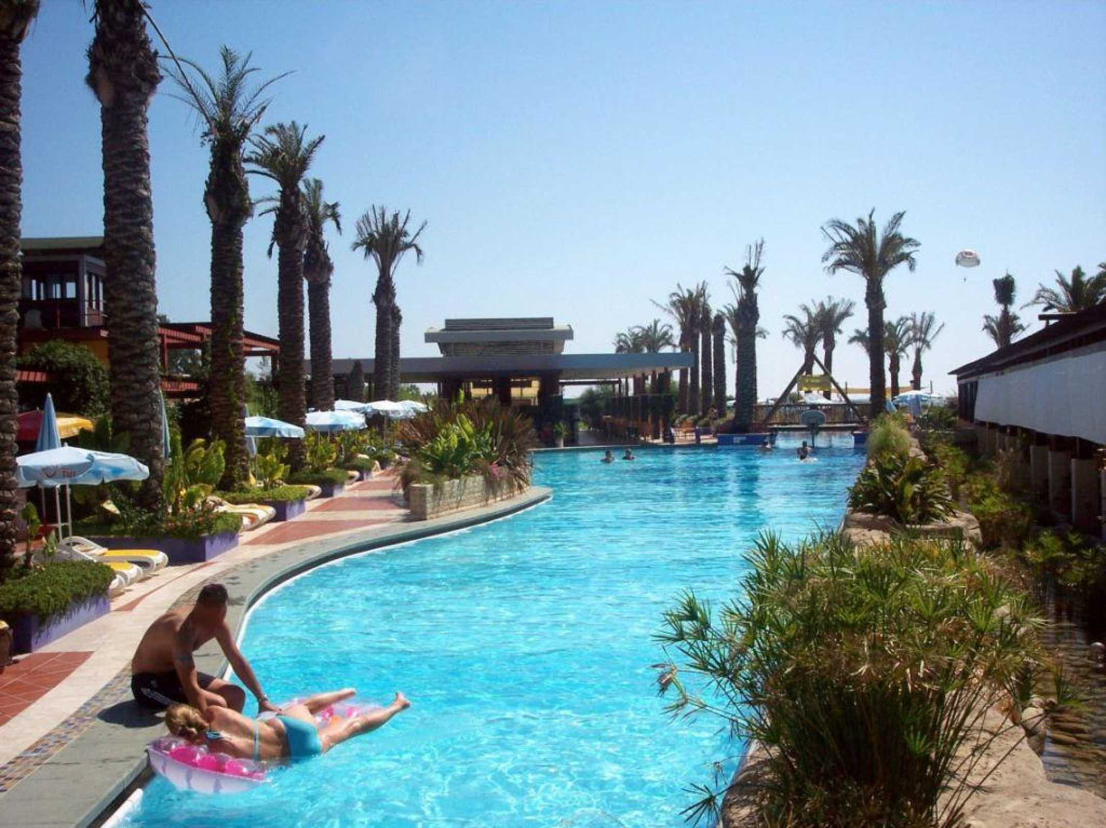 Großer Pool 1Im Hintergrund die Poolbar. Rechts unten der Außenbereich des Restaurants. Links die Animationsbühne