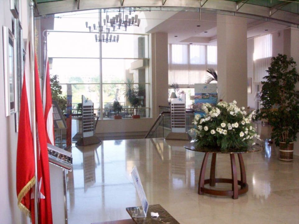 Linker Teil der großzügigen und modernen Lobby. Mittig der Abgang zu den Restaurants und zum Poolbereich. Links (mit den türkischen Flaggen) die Homage an Mustafa Kemal Atatürk, die in keinem öffentl. Gebäude fehlen darf...