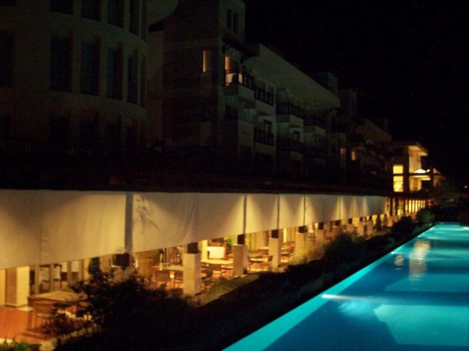 Blick vom Pool auf den Außenbereich des Restaurants.