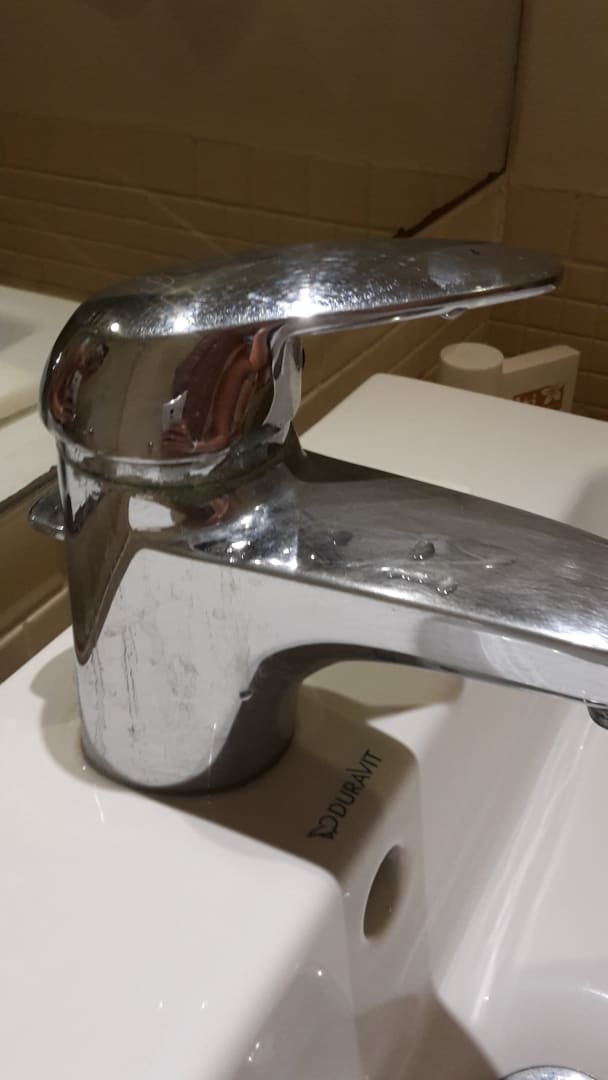 Schmutziger, verkalkter Wasserhahn im Bad