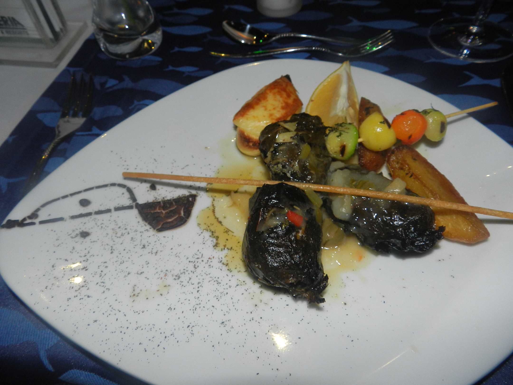 Fisch à la carte RestaurantWolfsbarsch in Weinblättern (dolma) gegrillt, könnt ich schon wieder essen, es war eine Geschmacksexplosion
