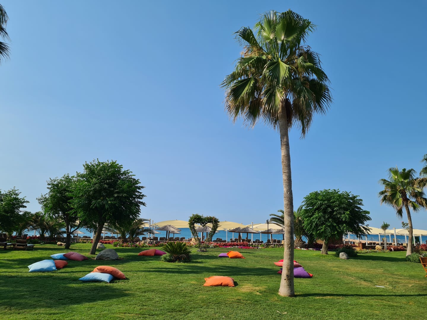 Rasenfläche zwischen dem Hauptrestaurant "Magico" und dem Strand