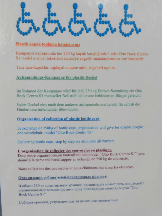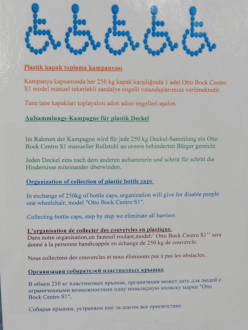 Bei einer bestimmten Gewichtsanzahl gesammelter Deckel bekommt ein behinderter Bürger einen Rollstuhl. Also fleißig sammeln für einen guten Zweck.