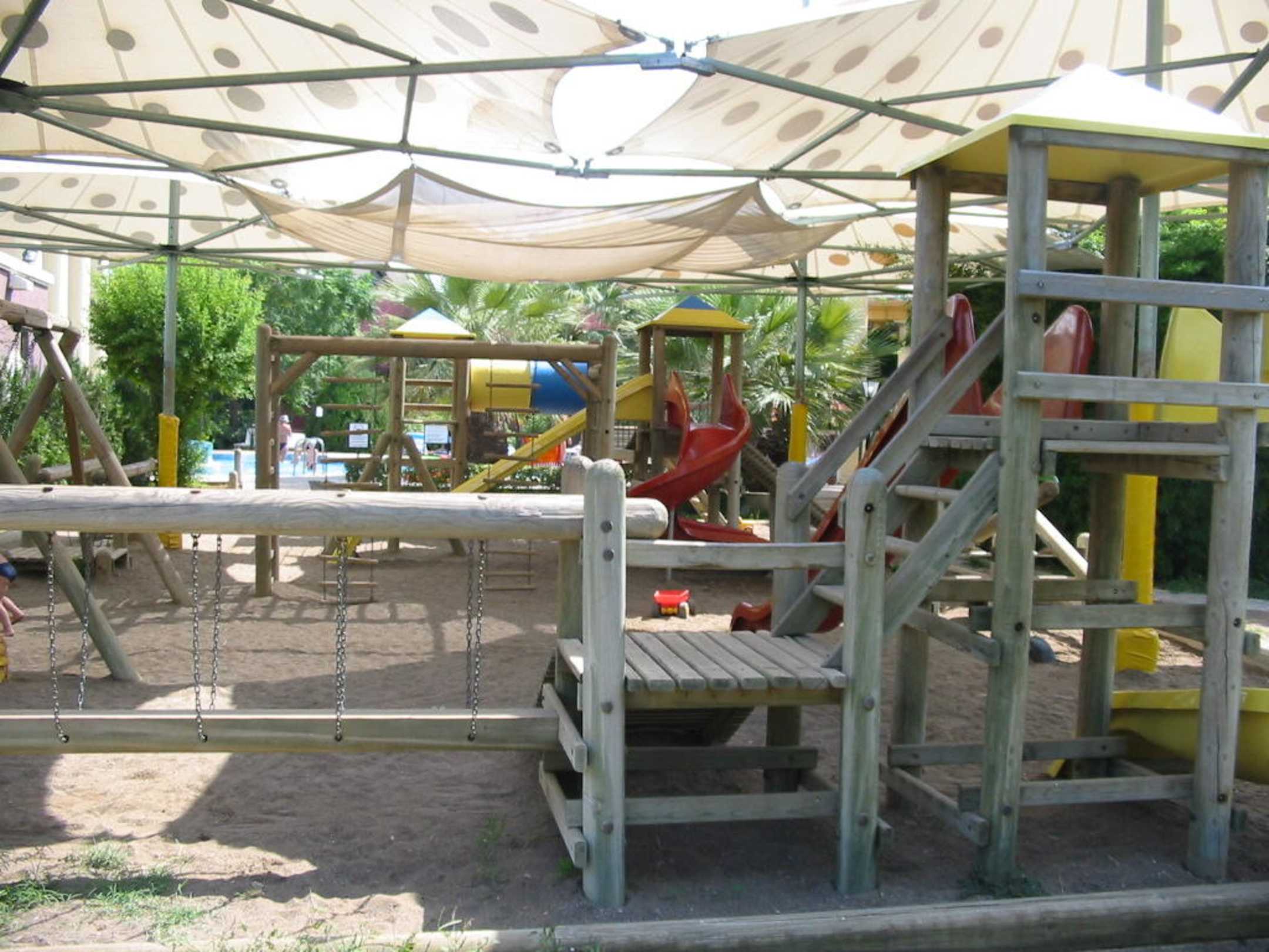 Spielplatzer ist mit einem Sonnensegel überdacht, so daß man auch tagsüber schön spielen kann.