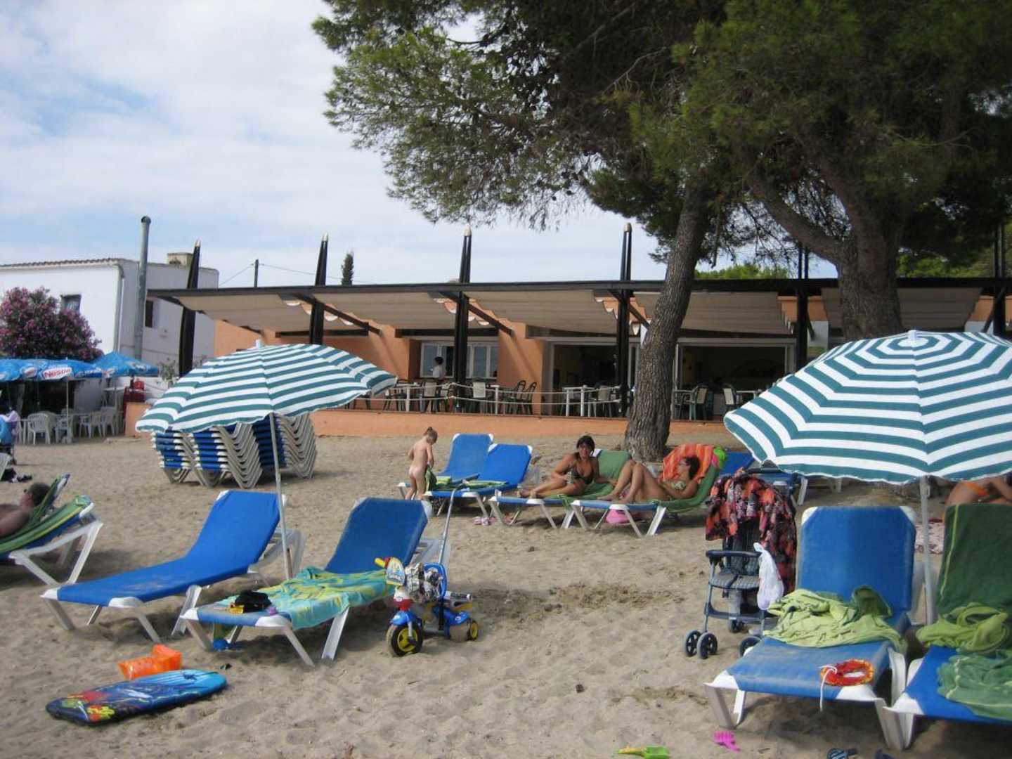 Blick vom Meer auf Strand und Strandrestaurant