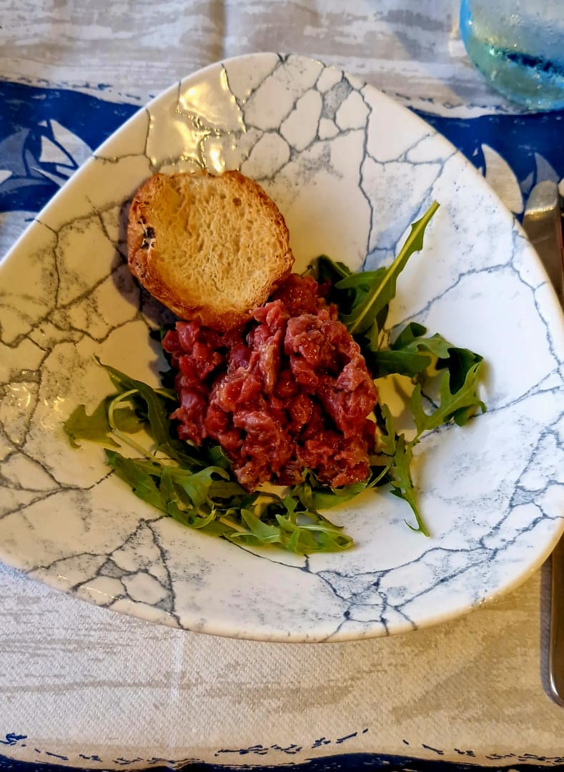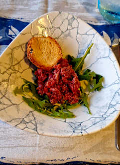 Spezialitäten Restaurant "Fish & Grill" - Beef Tatar (etwas anders als bei uns, aber trotzdem sehr lecker) garniert mit Ruccola und einem Brötchen.