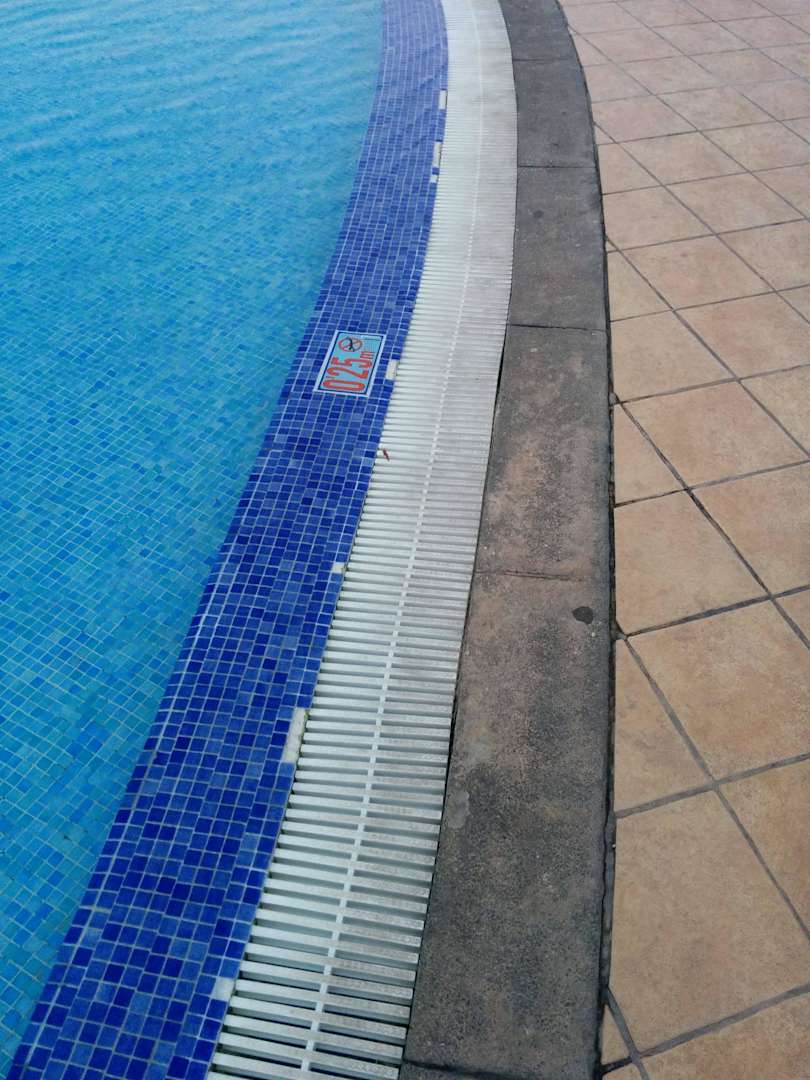 In der gesamten Poolanlage fehlen teilweise die Fliessen. Nicht nur am Rand, auch in anderen Bereichen. Sehr gefährlich für die Haut bzgl. Verletzungen.