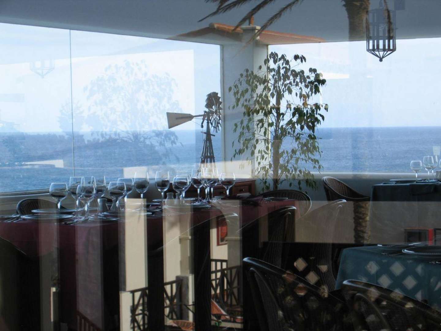 Blick von außen durch die Scheiben/das Restaurant mit Rundumblick