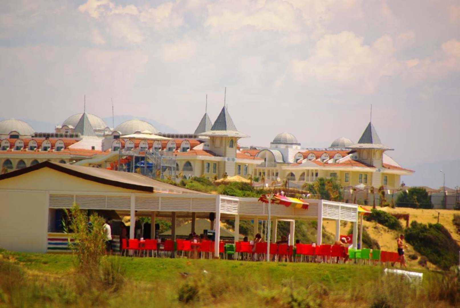 Am Strandbereich entlang dahinter das Hotel