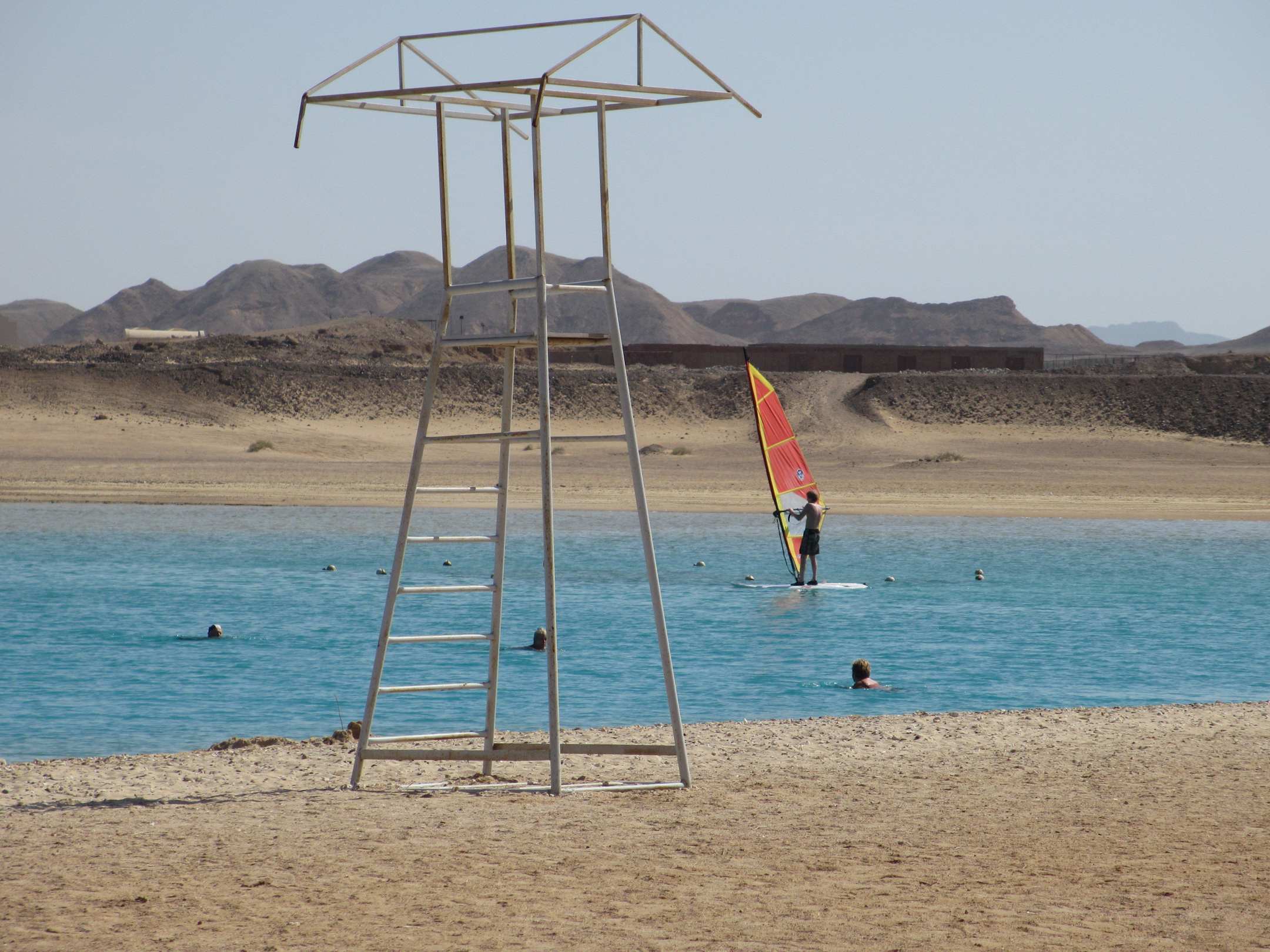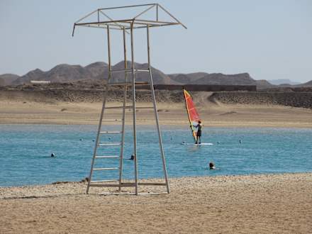 Surfer und Badegäste in der Lagune