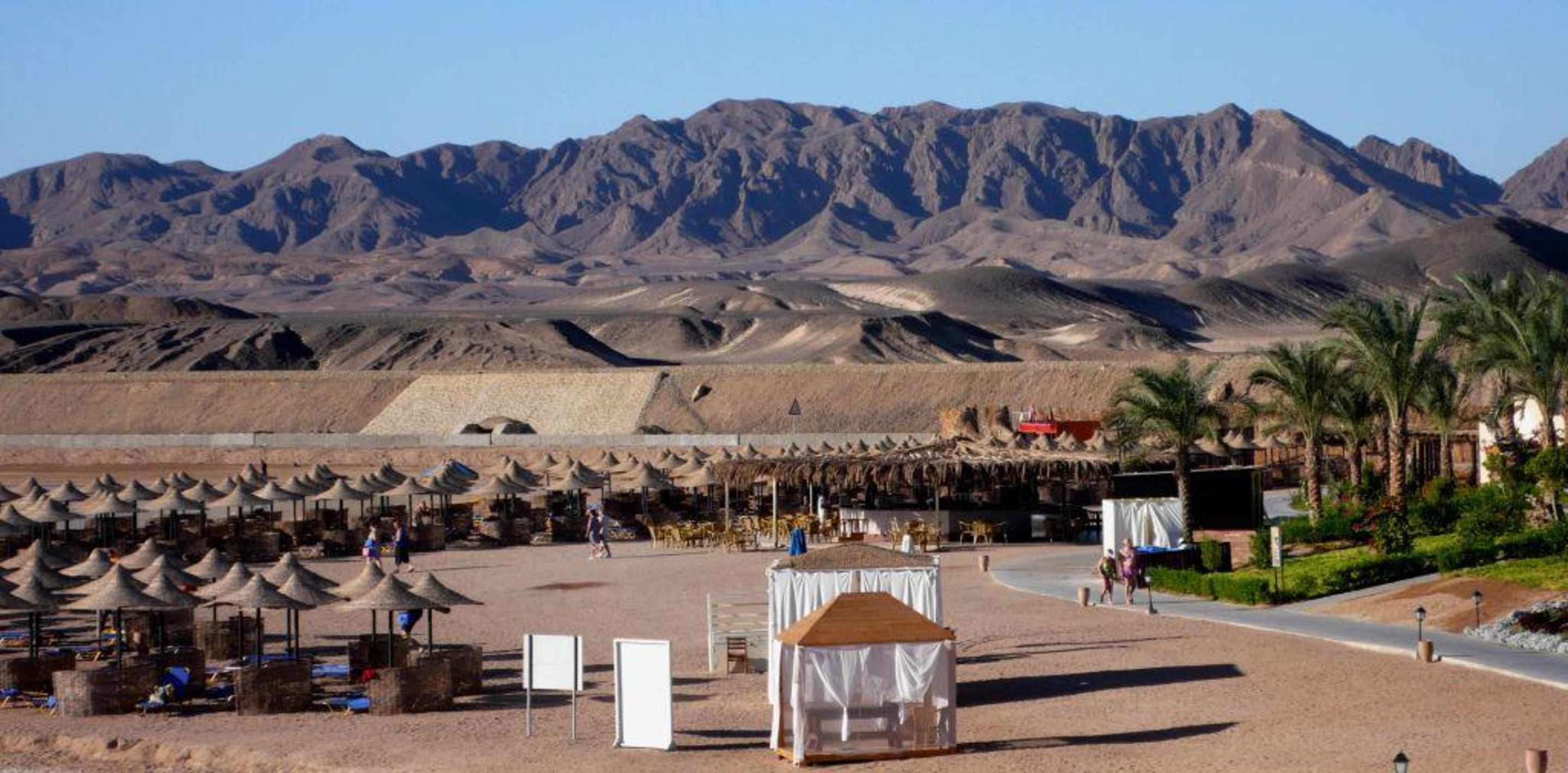 Strand mit Gebirgskette im Hintergrund